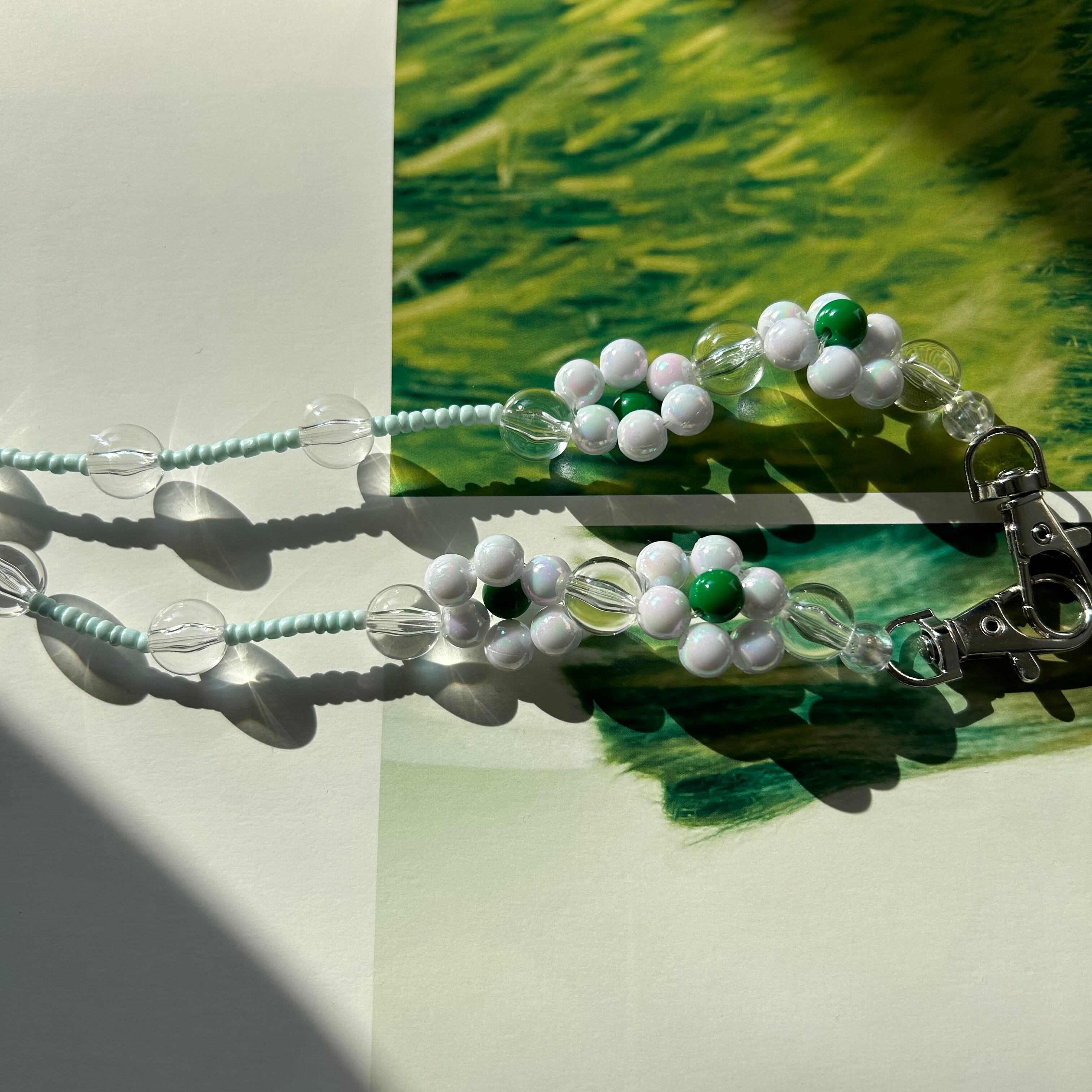 ⚪️ビーズスマホチェーン ⚪️カラー:ホワイト×グリーン ⚪️サイズ:約118cm ⚪️価格:2000円 ※ご購入前に必ず『information』をご確認ください。
